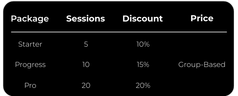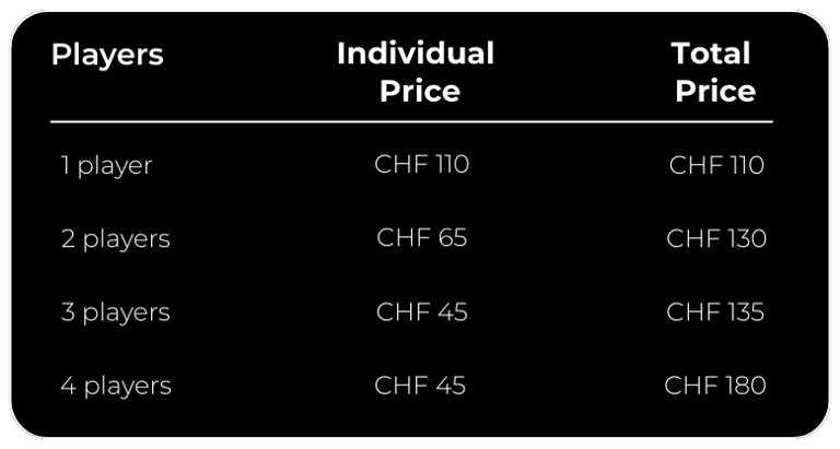 Example: A Progress Pack pack for 2 players would be: (65 CHF x 10) - 15% = 552,5 CHF per player instead of 650 CHF