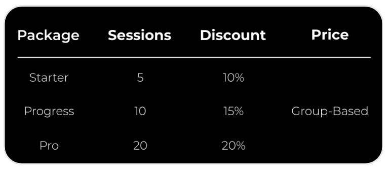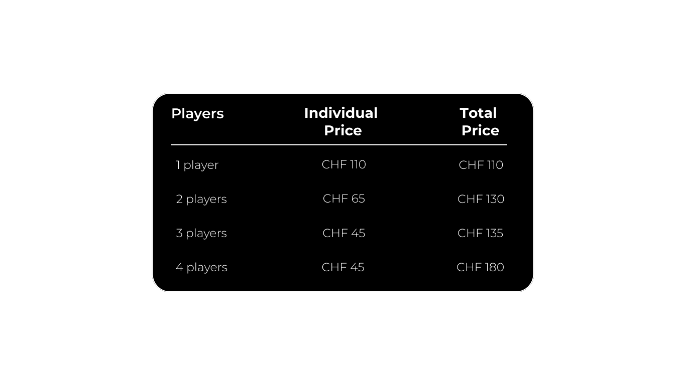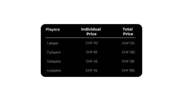 Beispiel: Ein Progress-Paket für 2 Spieler wäre: (65 CHF x 10) - 15 % = 552,5 CHF pro Spieler statt 650 CHF.
